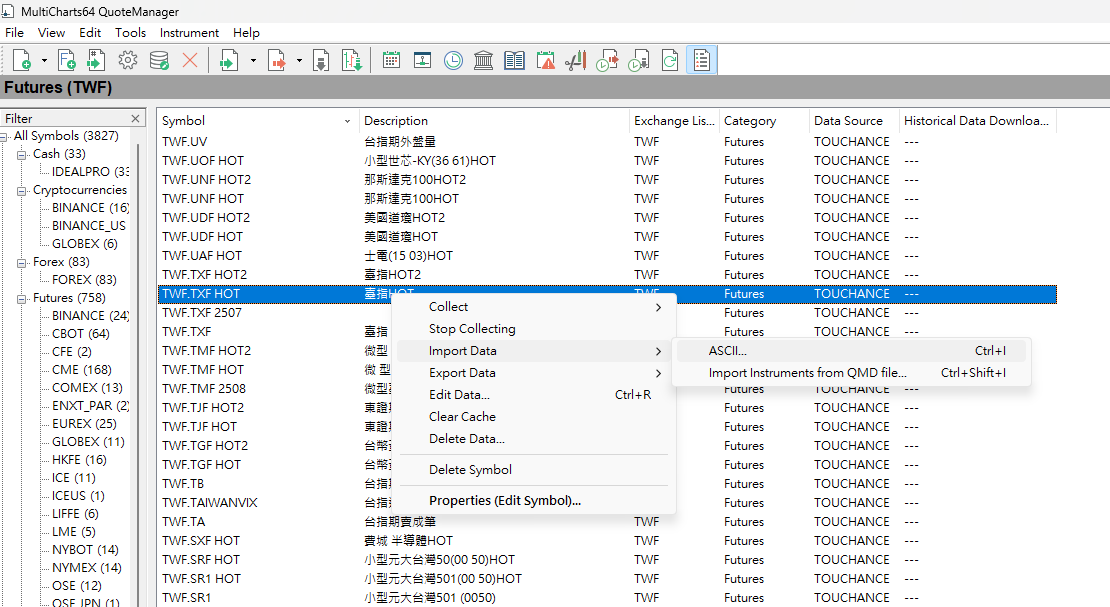 3. 滑鼠右鍵點選目標商品(例:TWF.TXF HOT),選 Import Data > ASCII...。