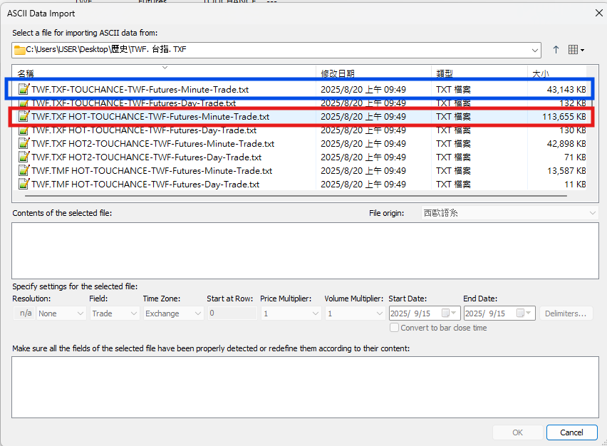 TWF.TXF HOT-...-Minute-Trade.txt",紅框"有HOT"的為台指期貨,藍框"沒有HOT"的為加權指數